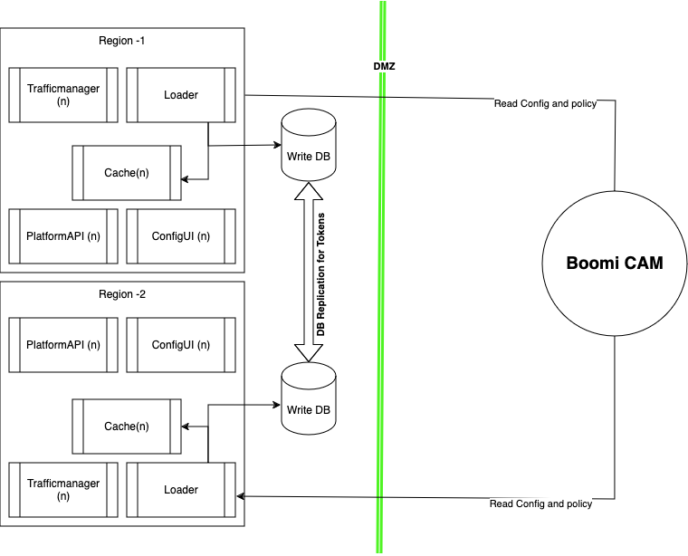 Each region has its own writable database with replication configured to share tokens. Alternatively, to enable HA within each region, you can use a single database with multiple read replicas.