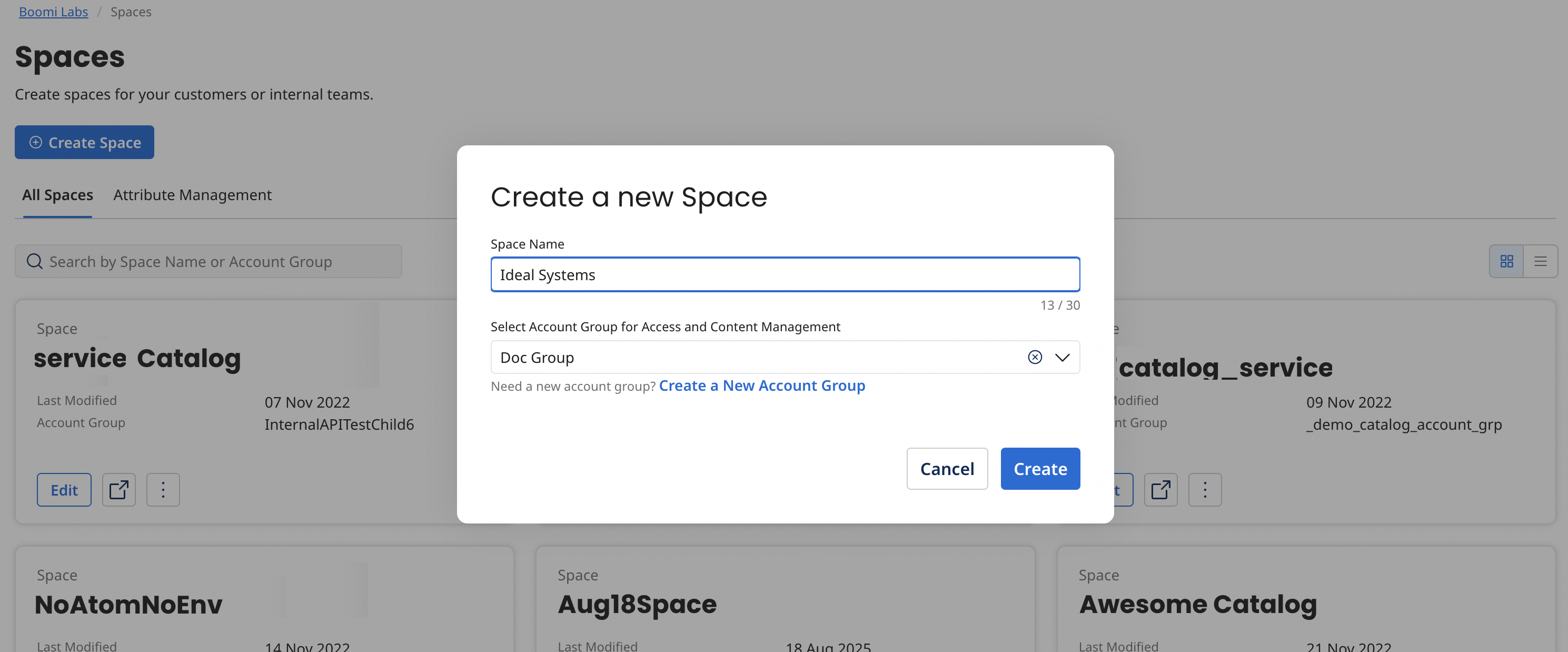 If your account has been granted Spaces admin privileges, you can create a Space in the admin UI for your internal teams or customers. The created Space can be shared with the intended users so that they can install, configure, manage, schedule, and quickly get started with Integrations.
