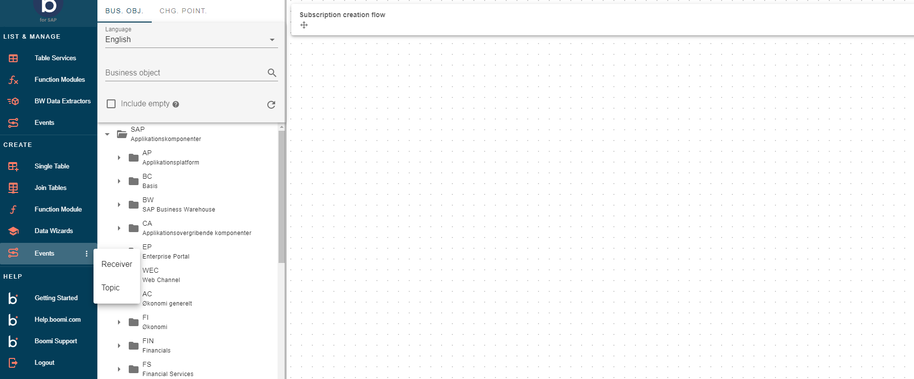 After choosing the Business Object you want to subscribe to an event, you can drag it onto the canvas or double-click it. This will show you the different types of events you can subscribe to.