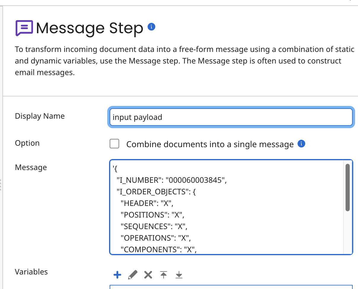 - We have to include Required optional Table parameters and Changing parameters along with importing parameters in the Input payload as JSON string and pass through the message component instead of Connector Parameters.