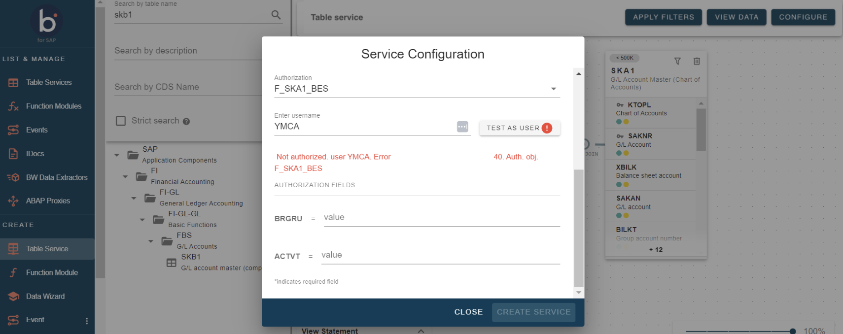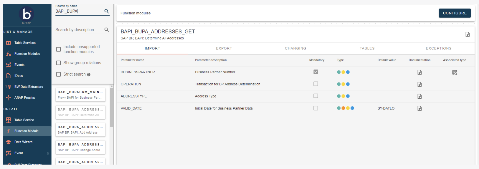 When you have found the Function Module you want to expose as a service, drag and drop it onto the canvas or double-click it. When unsupported FMs are dragged onto the canvas, they are highlighted to distinguish them from supported FMs.