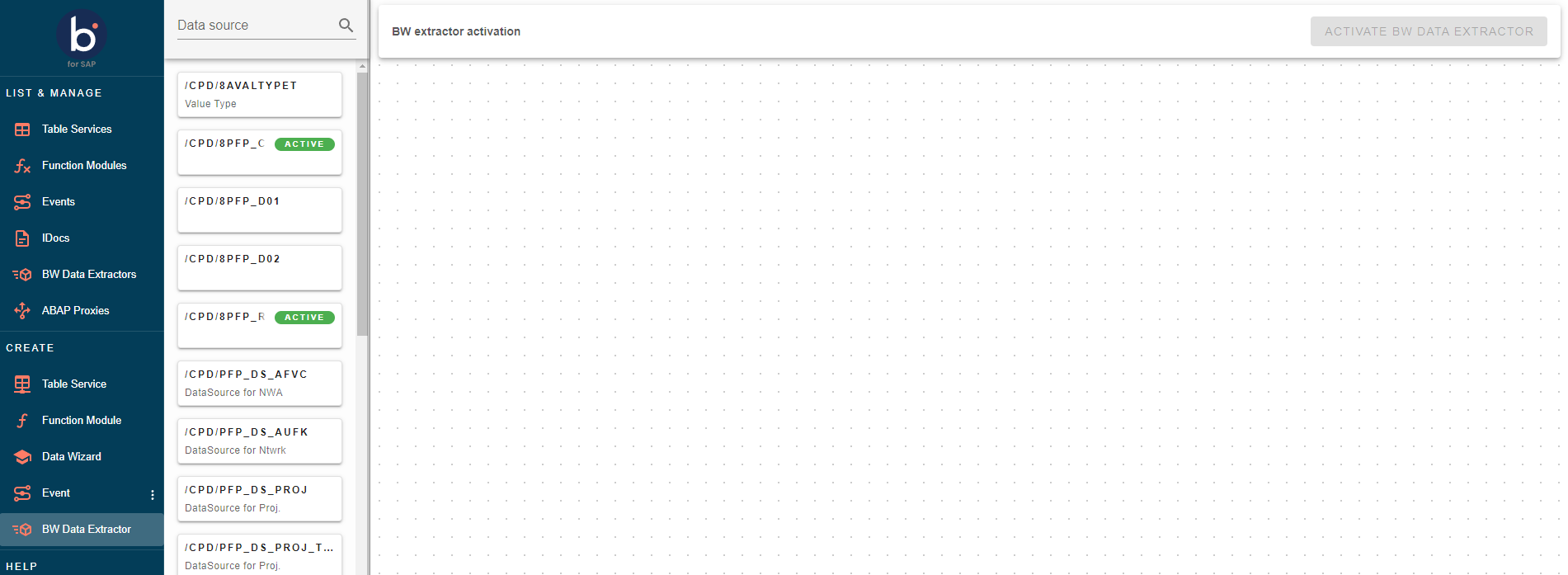- Navigate to the BW Data Extractor menu to locate the desired data source. Once found, drag it onto the canvas to access information about the extractor.