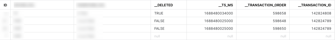 The TS_MS column, short for TIMESTAMP Milliseconds, holds integer values or null entries. Depending on the context, the platform shows timestamps in this column as integers or null. This column documents the timing of changes when using the CDC method.