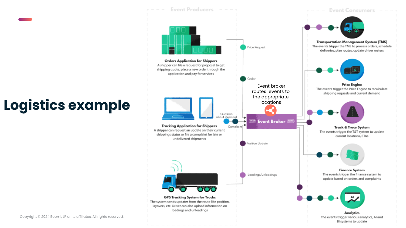 Event Streams, along with our Boomi integration process, decouples event producers (like the Orders App or GPS system) from event consumers (like the TMS or Finance System). Producers send events — such as a new order, position update, or complaint — to the broker.