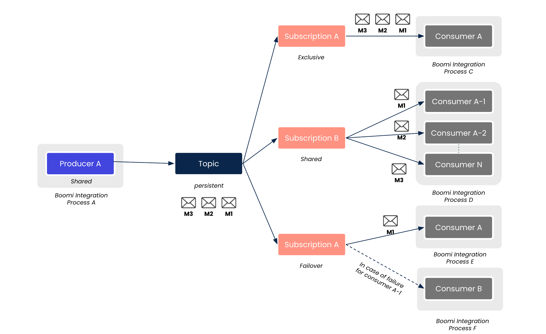 This publish/subscribe model ensures that if one system (like the warehouse API) is temporarily down, the other processes (like ERP updates and customer emails) are not affected.