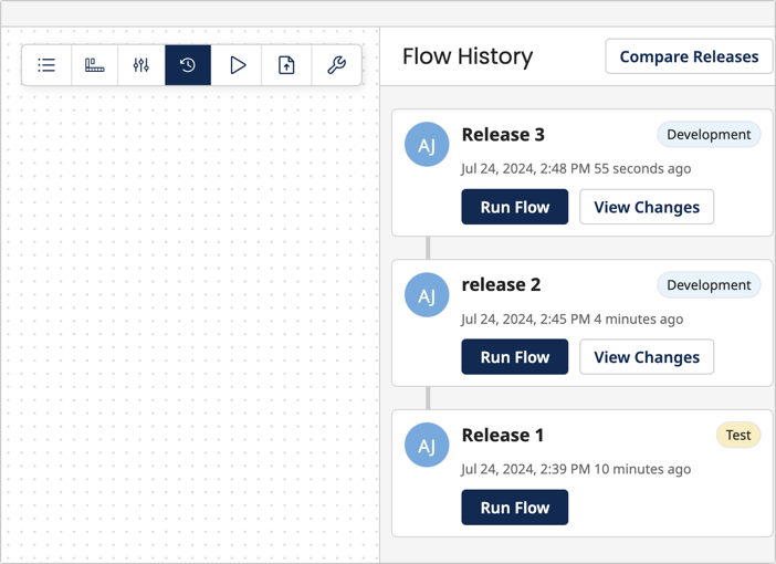 | Flow History allows you to view and compare previous releases of a Flow. |