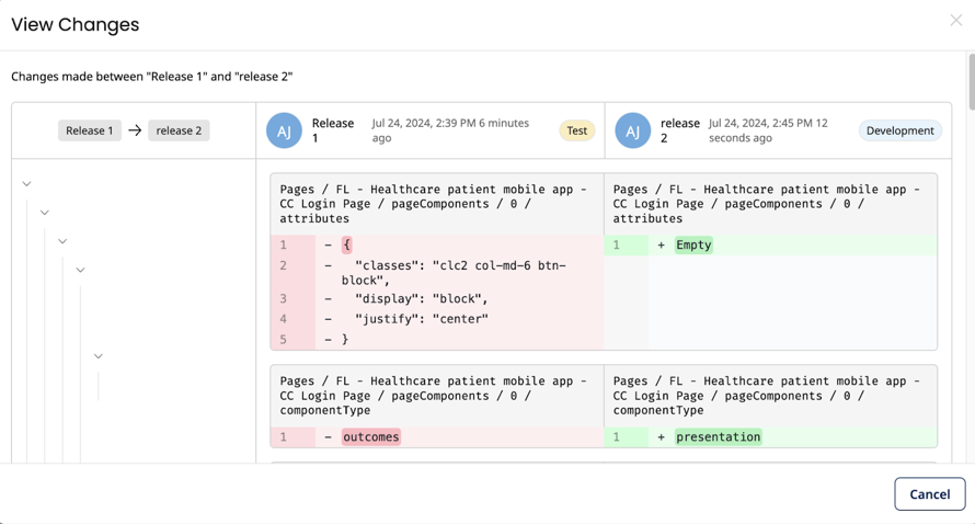 - Click Compare Releases button to compare two versions by selecting them.