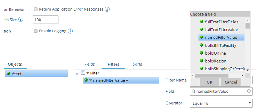 Use this search method when you specify “namedFilterValue” as a parameter in Query operation Filters tab.
