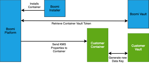 We provide two options for KMS: a fully Boomi-hosted vault, and a Boomi-hosted vault supplemented by a customer-managed vault. In both cases, the encryption in transit is handled by the Boomi-hosted vault. In the BYOV (Bring Your Own Vault) mode, secrets are re-encrypted on the customer container by the customer’s own HashiCorp Vault.