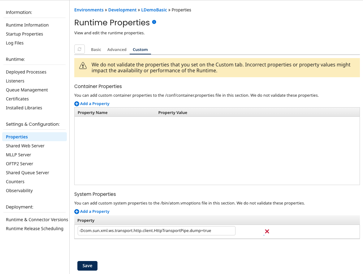 Because changes to these properties do not take effect until the runtime is restarted, you are prompted to restart. You have the option to restart now or restart later.