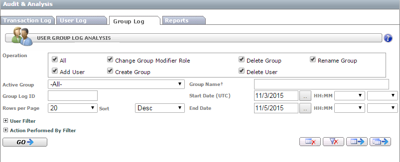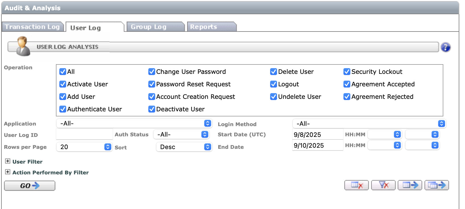 - Sort: Report result is sorted by User Log ID. Use this filter to specify ascending or descending order. For further sorting, export the results to Excel.