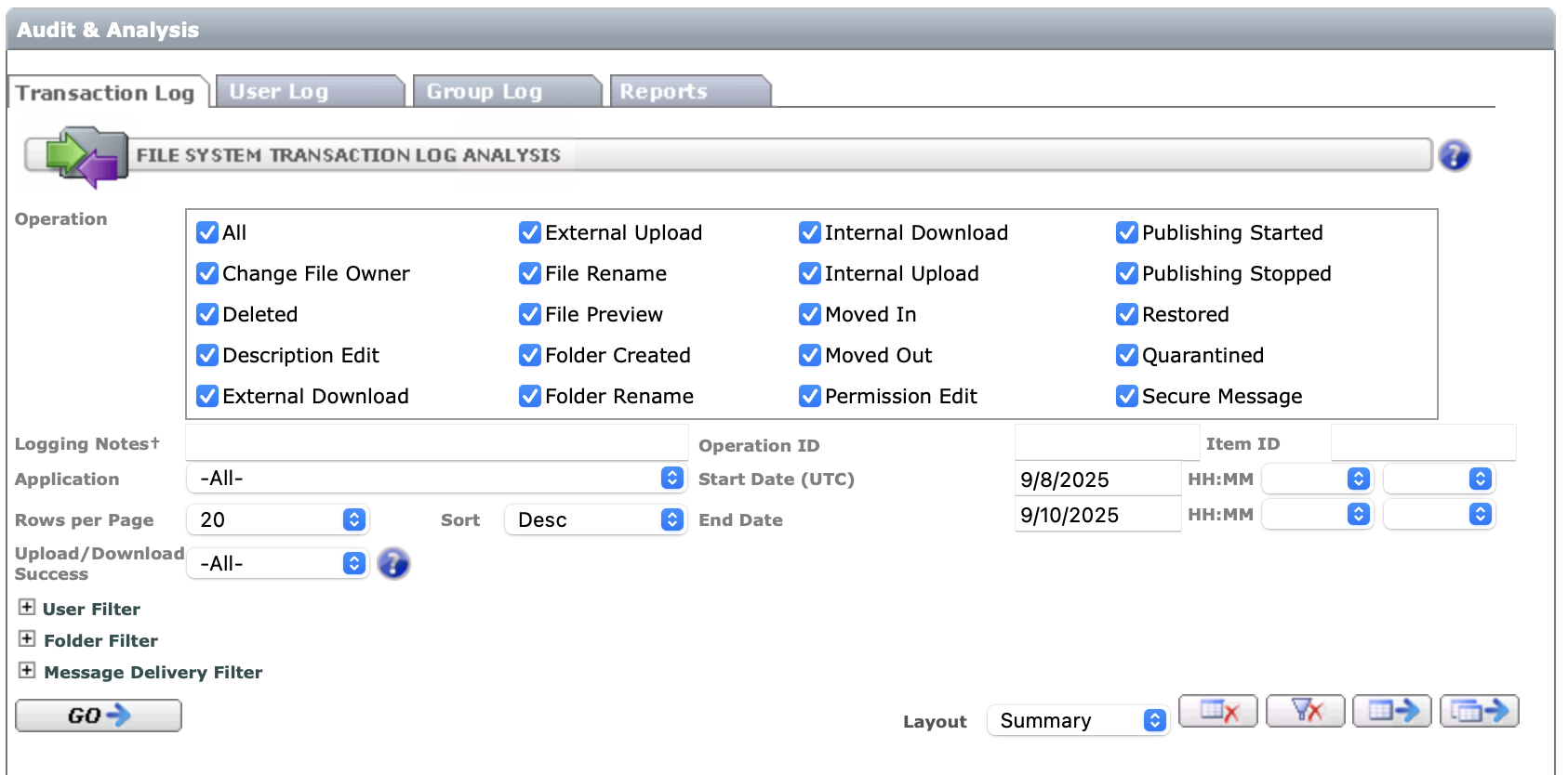 The Transaction Log report lets both users and administrators analyze file system activity. The MFT server records all file system transactions, with each transaction comprising an operation with a detailed list of the file and/or folder items that include operation-specific data.