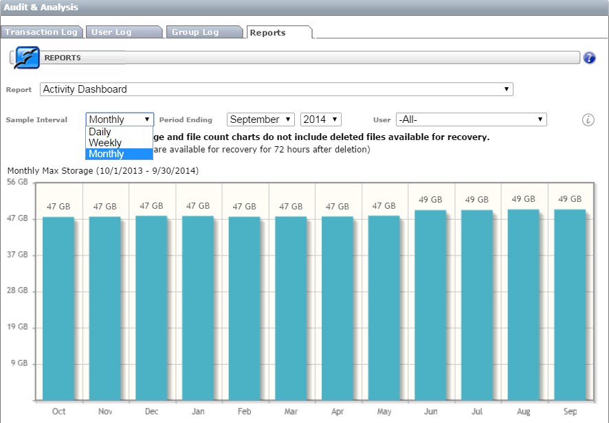 These reports can be further refined by selecting to display them by daily, weekly or monthly intervals. You can also select which interval to display in the graphs so that you have complete control of what is going on within your MFT site.