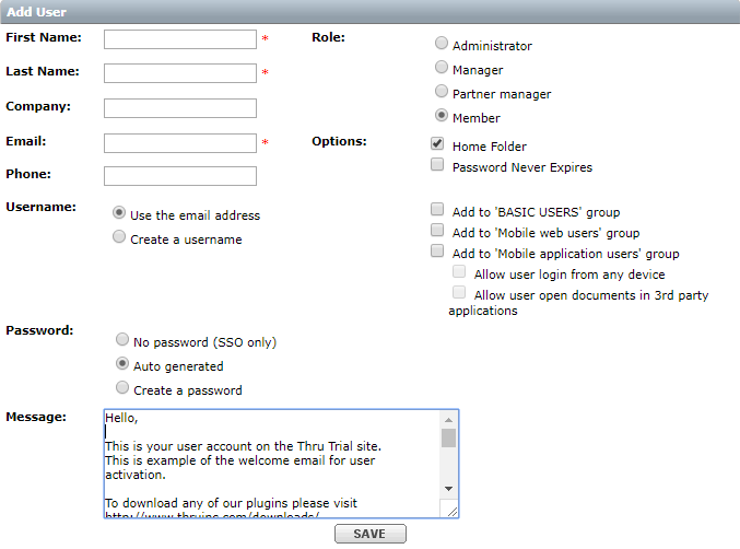 Create new users on your File Sharing site by clicking Add User from the User Management page (Account Name > Administration > Users).