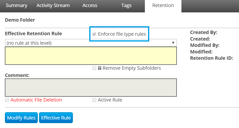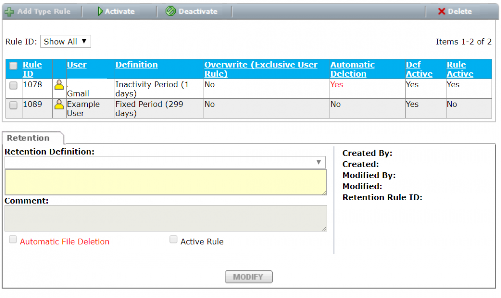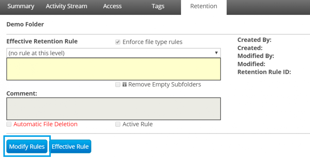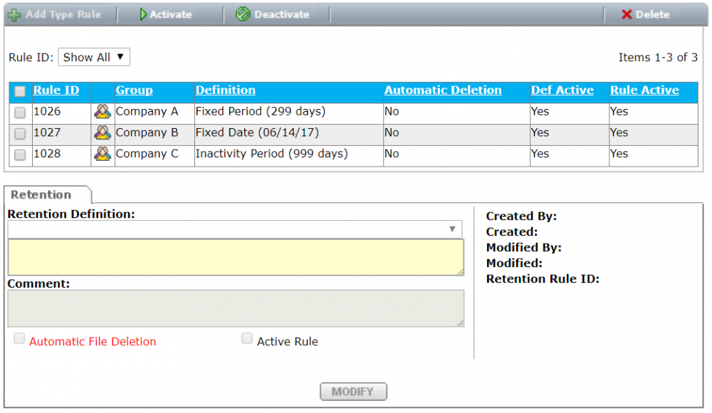 - Only Retention Administrators can create or modify rule setup. All the users can view retention tabs when they navigate the system.