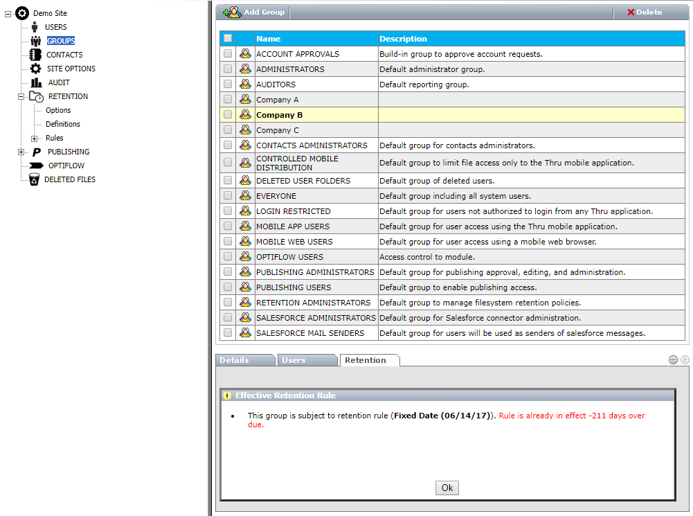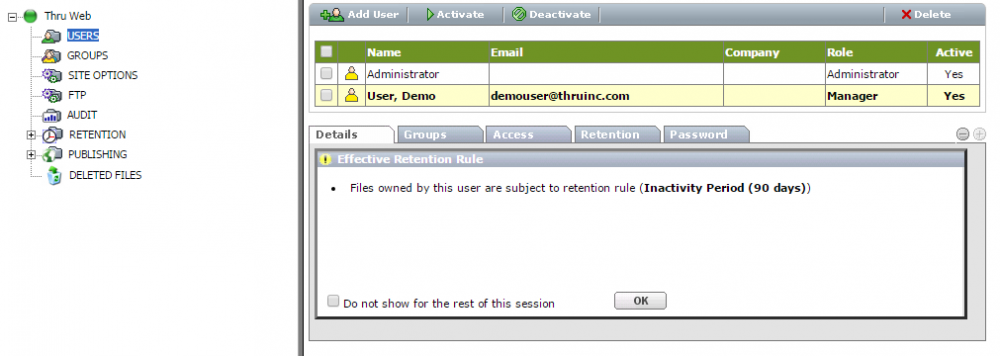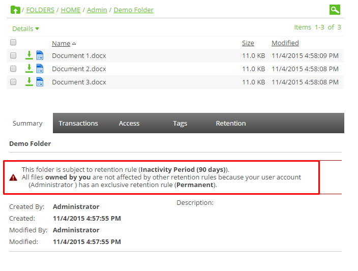 The retention rules are displayed not only to administrators but to all users as they navigate the system.