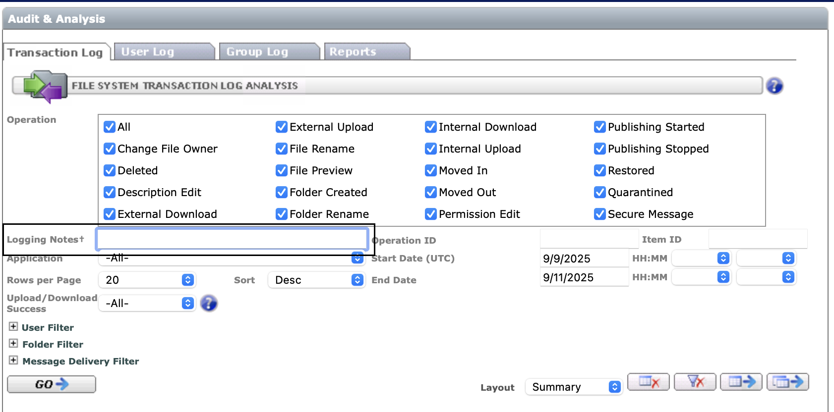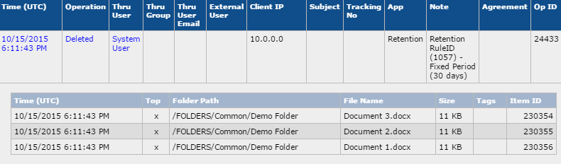 You can view files deleted by retention rules. Search for a rule number using the Logging Note filter.