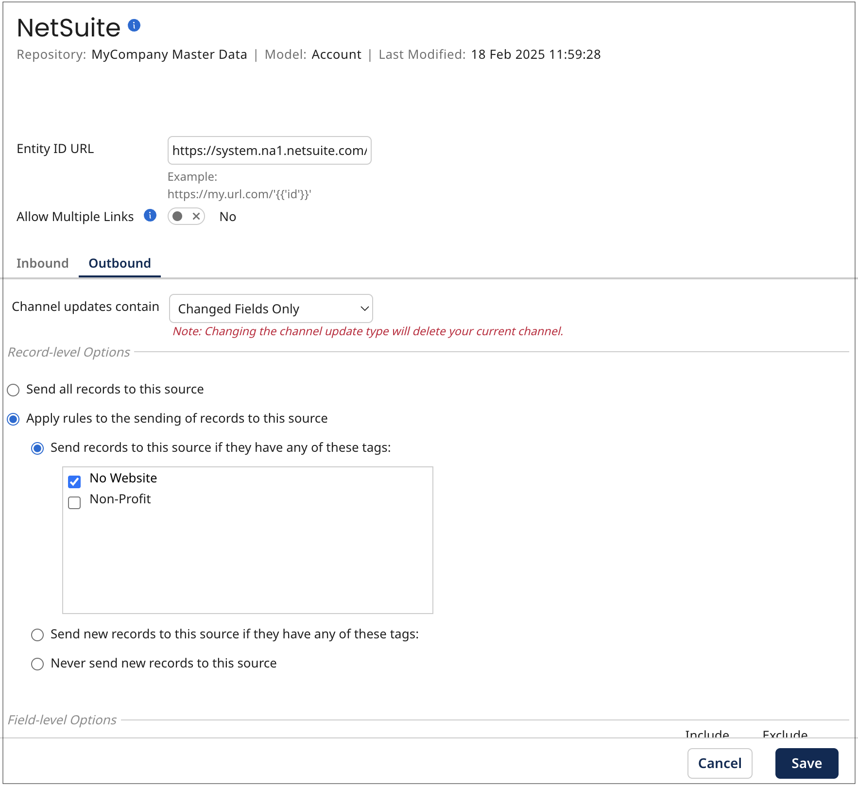 • Select Send records to this source if they have any of these tags if you have created tags in your model, you can use them to create this rule. The source receives updates if the record has the tag or tags specified. Read Managing Tags to learn more.
