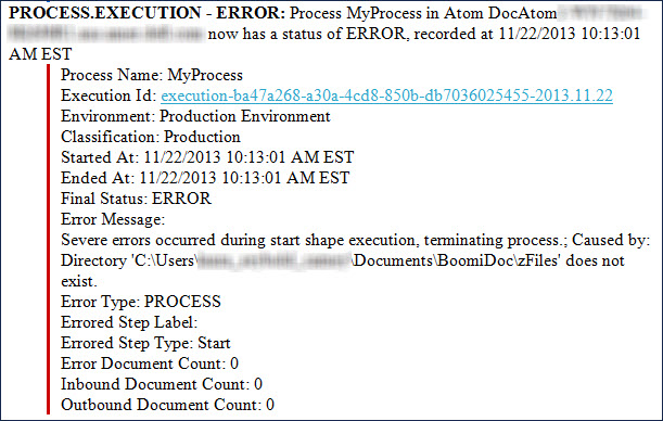 The PROCESS.EXECUTION alert identifies the start and end time for the execution of a runtime's process. The number of inbound and outbound documents are recorded, along with any documents that may have encountered errors during the process execution. The alert includes the process’ execution ID and a link to the execution. Clicking the link takes you to the process on the Process Reporting page. INFO log level alerts always send an execution status if the process runs to completion. Accompanying warning and error alerts can also be logged, depending on your process flow.