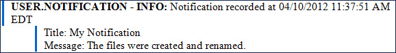 The USER.NOTIFICATION alert identifies a Notify step having the Enable Events option that was included in a process execution. The message level (Info, Warning, or Error) set in the Notify step affects the type of email alert that is sent, but it does not stop a document or set of documents from processing to completion. The Title and Message fields in the USER.NOTIFICATION alert display the results of those configurable fields in the Notify step: